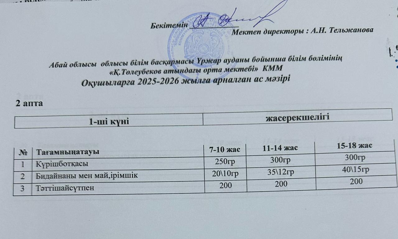 Ас мәзірі 2 апта 1 күн » Коммунальное Государственное учереждение "Средняя школа-сад имени Койшибая Толеубекова"