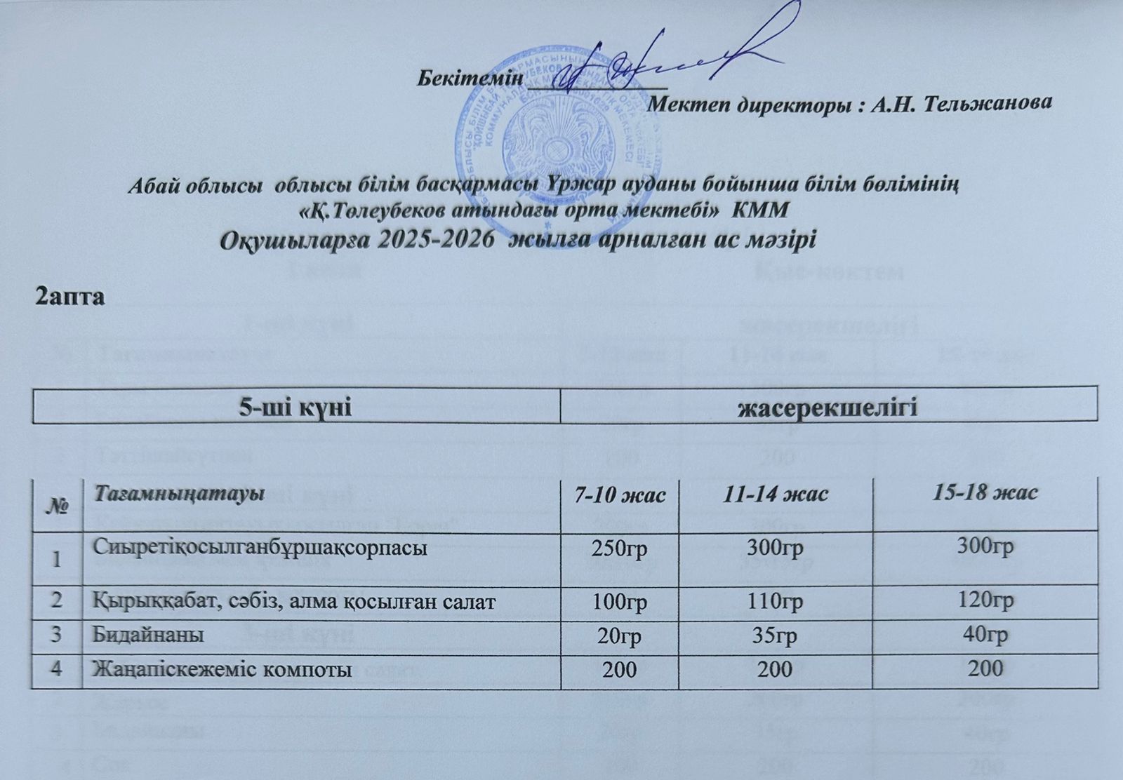 Ас мәзірі 2 апта 5күн » Коммунальное Государственное учереждение "Средняя школа-сад имени Койшибая Толеубекова"